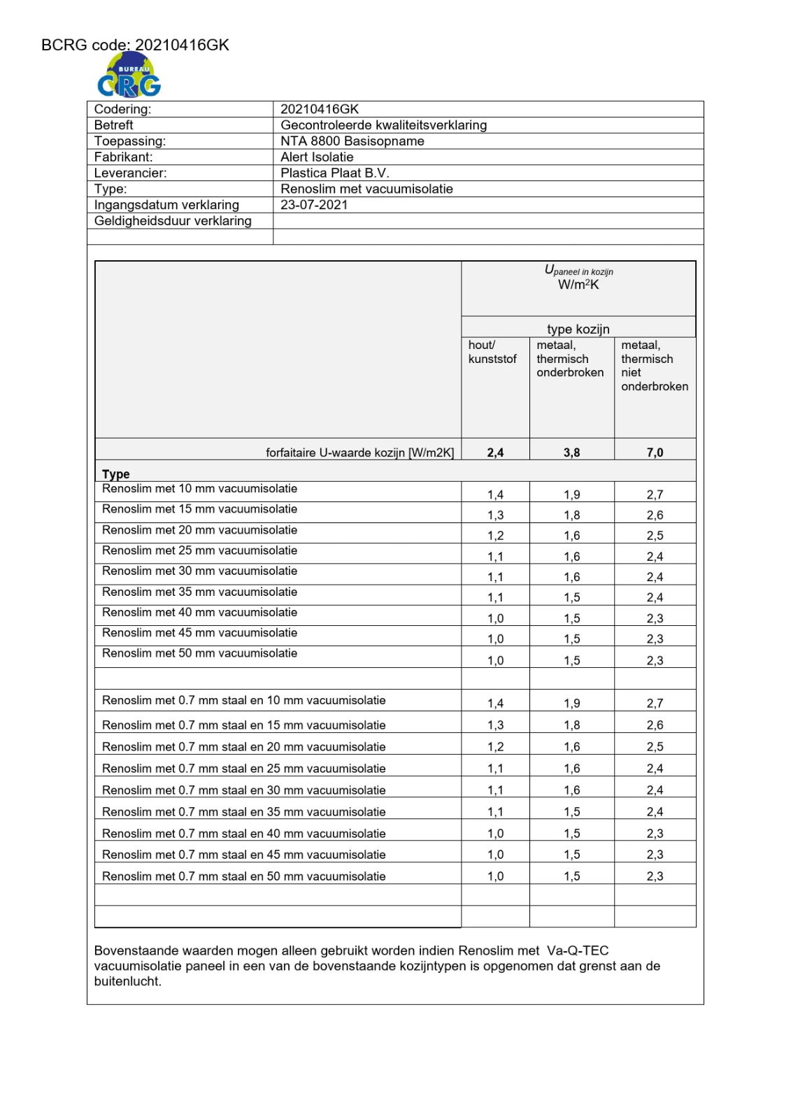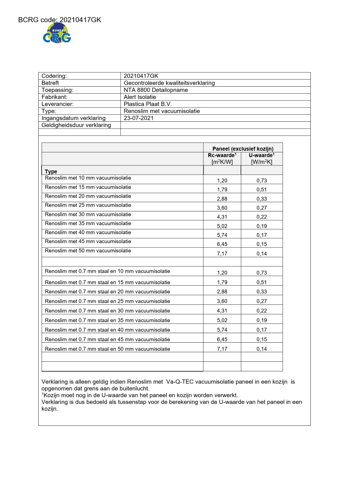Isolatiewaarden vacuüm isolatie: